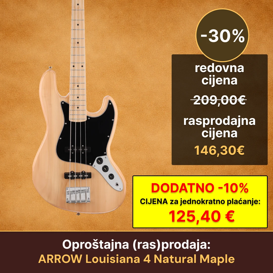 ARROW Louisiana 4 Bass Natural Maple/Black je bas gitara koja pomiruje pristupačnu cijenu s odličnom izradom i kvalitetom zvuka. Izvanredan je izbor za početak glazbene karijere, ali je zapravo i odgovor na potrebe svih basista koji traže više od dobre vrijednosti za novac.