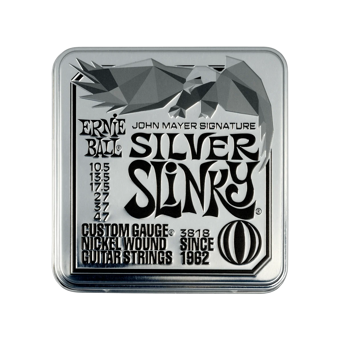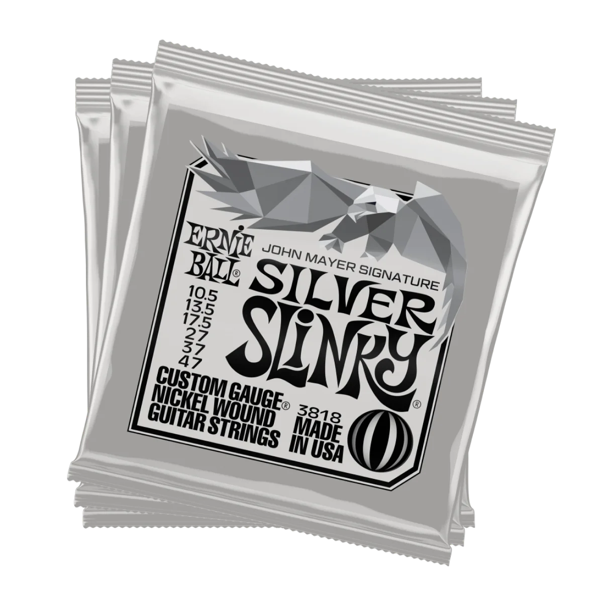 ERNIE BALL 3818 John Mayer Silver Slinky (3P) 10.5-47 su žice za električnu gitaru obložene niklom i omotane oko šesterokutne čelične jezgre od kositra, u izdanju 3-paketa.