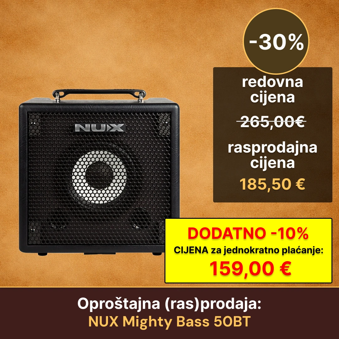 NUX MIGHTY BASS 50BT je malo i svestrano pojačalo za bas gitaru, odlično za probe, snimanja i manje nastupe. Ima ugrađen vrhunski zvučnik d 6,5 inča i pojačalo D-klase od 50 W, što ga čini iznimno kompaktnim i pogodnim za prijenos. Nudi obilje različitih zvukova i simulacija različitih bas pojačala. Pomoću besplatne aplikacije može se aktivirati funkcija bubnjeva i na taj način vježbati s bubnjevima, a osim toga može se aktivirati i looper te snimiti fraza. Prikladno je i za manje pozornice jer sadrži i DI izlaz koji omogućuje spajanje na središnji zvučni sustav.